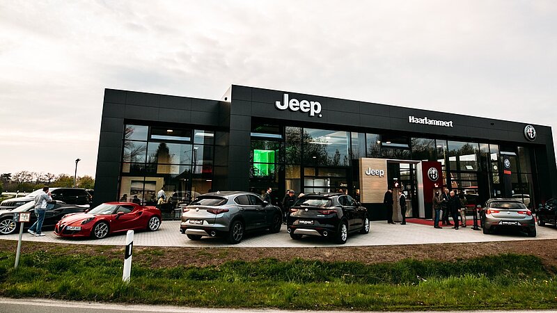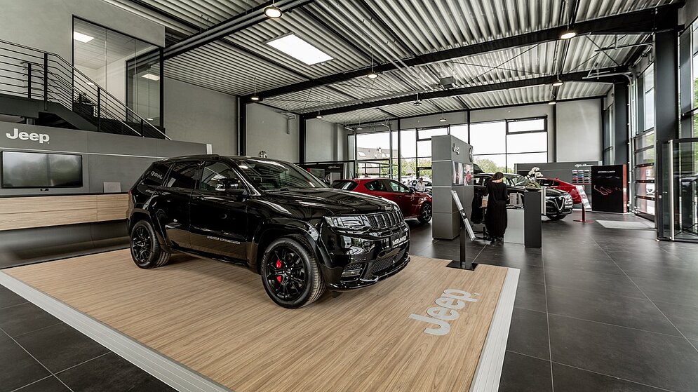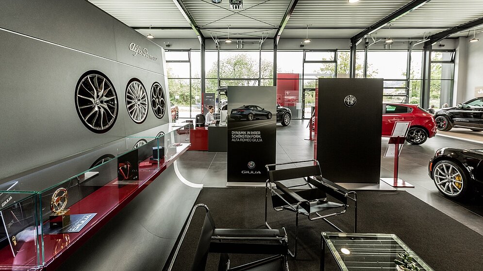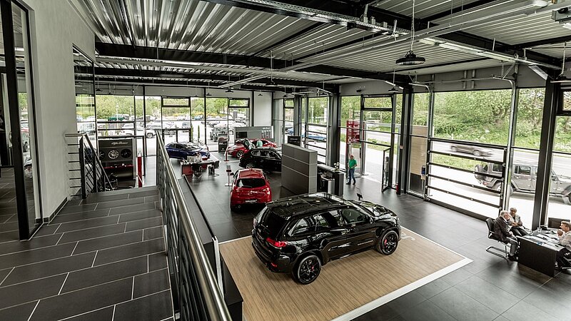 So entstand nach dem Abriss der alten, kleinen Ausstellung ein neuer, gut 500 qm großer Showroom für Jeep und Alfa Romeo mit Galeriegeschoss inklusive Fahrzeugauslieferung und Dialogannahme. Die CI-gerechte „Runderneuerung“ erfolgte bei laufendem Geschäftsbetrieb.