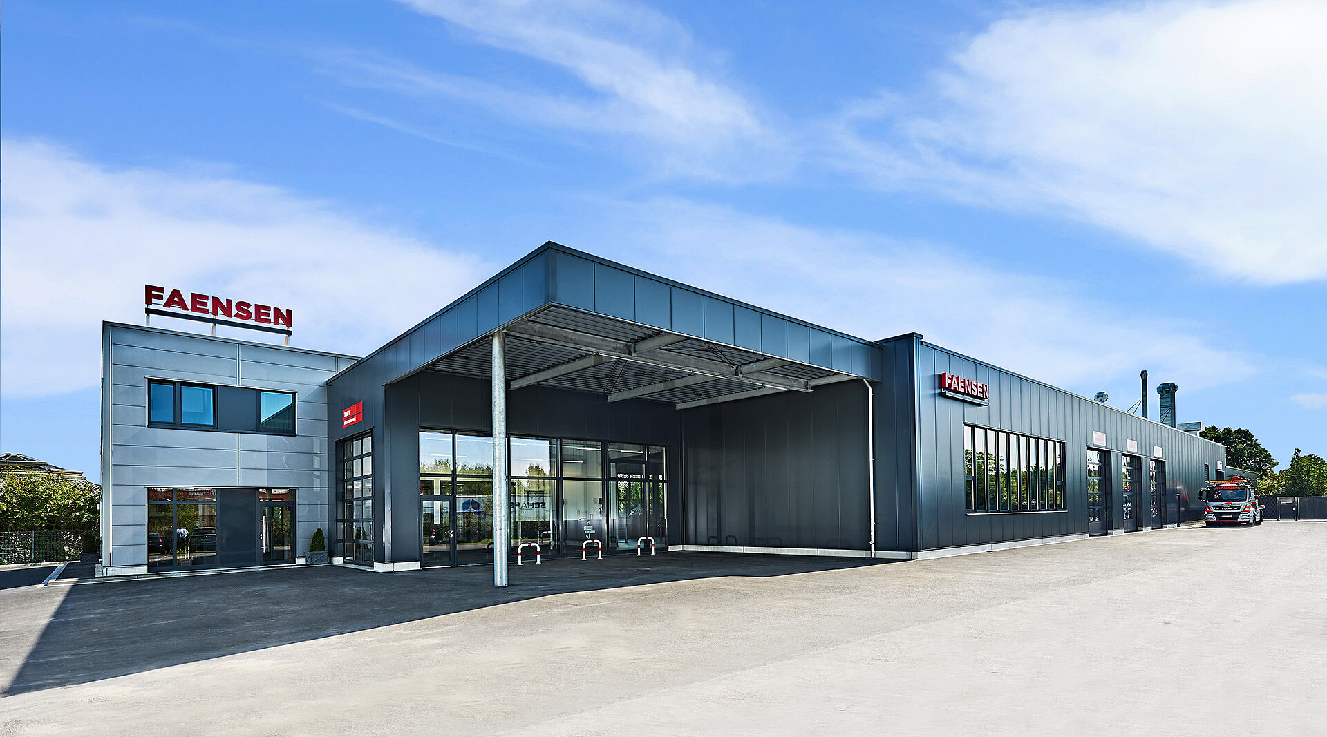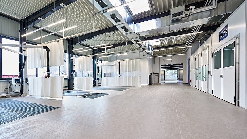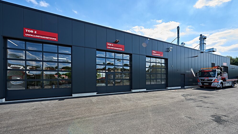 Die Wirtschaftlichkeit des Geschäftsbetriebes konnte aufgrund gut durchdachter Arbeitsprozesse deutlich gesteigert werden. Die Anordnung von der Direktannahme über die mechanische Werkstatt, Karosseriewerkstatt bis zur Vorbereitung und Lackierkabine mit Querverschub zur Trockenkabine sowie Finishplatz und schließlich bis zur Fahrzeugpflege ermöglicht effektive Abläufe. Die Bereiche „Fahrzeugsicherstellung, Leihwagen, Abschleppdienst sowie Büro- und Sozialräume“ runden das Raumprogramm ab.